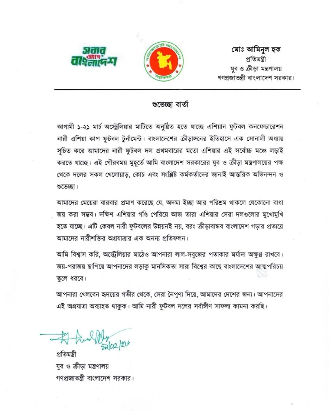 শুভেচ্ছা বার্তায় প্রতিমন্ত্রী বলেন, আমাদের মেয়েরা বারবার প্রমাণ করেছে যে, অদম্য ইচ্ছা আর পরিশ্রম থাকলে যেকোনো বাধা জয় করা সম্ভব। দক্ষিণ এশিয়ার গণ্ডি পেরিয়ে আজ তারা এশিয়ার সেরা দলগুলোর মুখোমুখি হতে যাচ্ছে। এটি কেবল নারী ফুটবলের উন্নয়নই নয়, বরং ক্রীড়াবান্ধব বাংলাদেশ গড়ার প্রত্যয়ে আমাদের নারীশক্তির অগ্রযাত্রার এক অনন্য প্রতিফলন।
