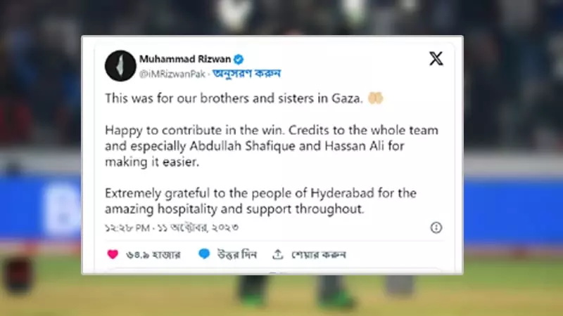 ইসরায়েলের হামলায় ফিলিস্তিনেরও কয়েকশ লোক নিহত হয়েছেন। টুইটারে রিজওয়ান লিখেছেন, ‘গাজার ভাই-বোনদের জন্য আমার এই সেঞ্চুরি উৎসর্গ করলাম।’