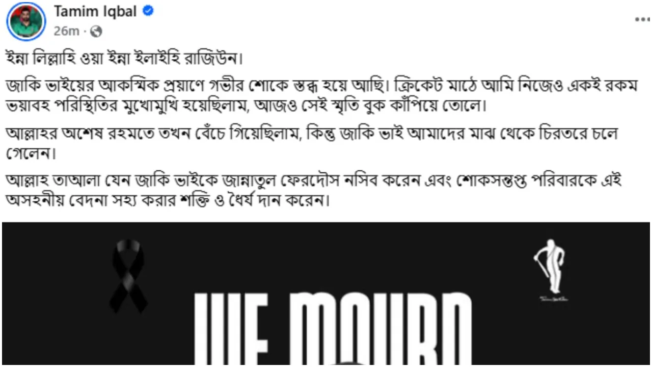 নিজের স্ট্যাটাসে তামিম ইকবাল লিখেছেন, ইন্না লিল্লাহি ওয়া ইন্না ইলাইহি রাজিউন। জাকি ভাইয়ের আকস্মিক প্রয়াণে গভীর শোকে স্তব্ধ হয়ে আছি। ক্রিকেট মাঠে আমি নিজেও একই রকম ভয়াবহ পরিস্থিতির মুখোমুখি হয়েছিলাম, আজও সেই স্মৃতি বুক কাঁপিয়ে তোলে। আল্লাহর অশেষ রহমতে তখন বেঁচে গিয়েছিলাম, কিন্তু জাকি ভাই আমাদের মাঝ থেকে চিরতরে চলে গেলেন।