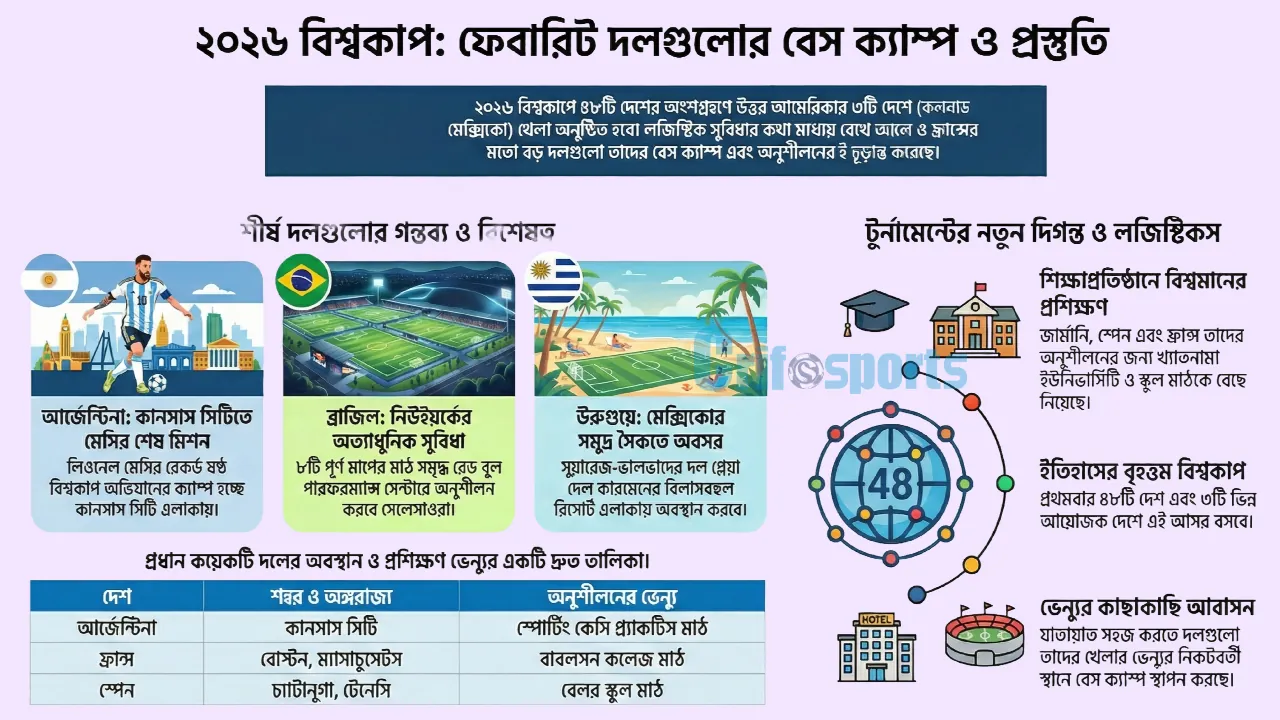 আসন্ন ২০২৬ ফুটবল বিশ্বকাপ উপলক্ষ্যে শুরু হয়ে গেছে বিশাল কর্মযজ্ঞ। যুক্তরাষ্ট্র, কানাডা ও মেক্সিকো— এই তিন দেশে যৌথভাবে আয়োজিত হতে যাওয়া বিশ্ব আসরে অংশ নেবে রেকর্ড ৪৮টি দেশ। দীর্ঘ এই যাত্রায় ফুটবলারদের ক্লান্তি কমাতে এবং সেরা প্রস্তুতি নিশ্চিতে দলগুলো বেছে নিচ্ছে তাদের পছন্দের ‘বেস ক্যাম্প’।