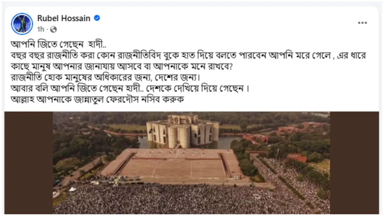 শনিবার (২০ ডিসেম্বর) ফেসবুকে জাতীয় সংসদ ভবনের দক্ষিণ প্লাজায় অনুষ্ঠিত হাদির নামাজে জানাজায় লাখো মানুষের উপস্থিতির কয়েকটি ছবি শেয়ার করেছেন রুবেল হোসেন।